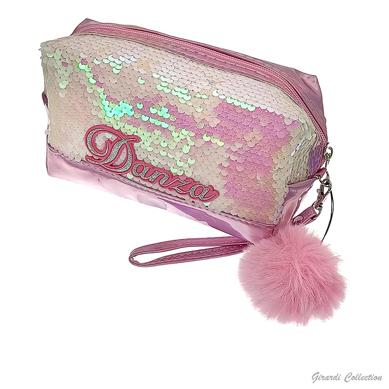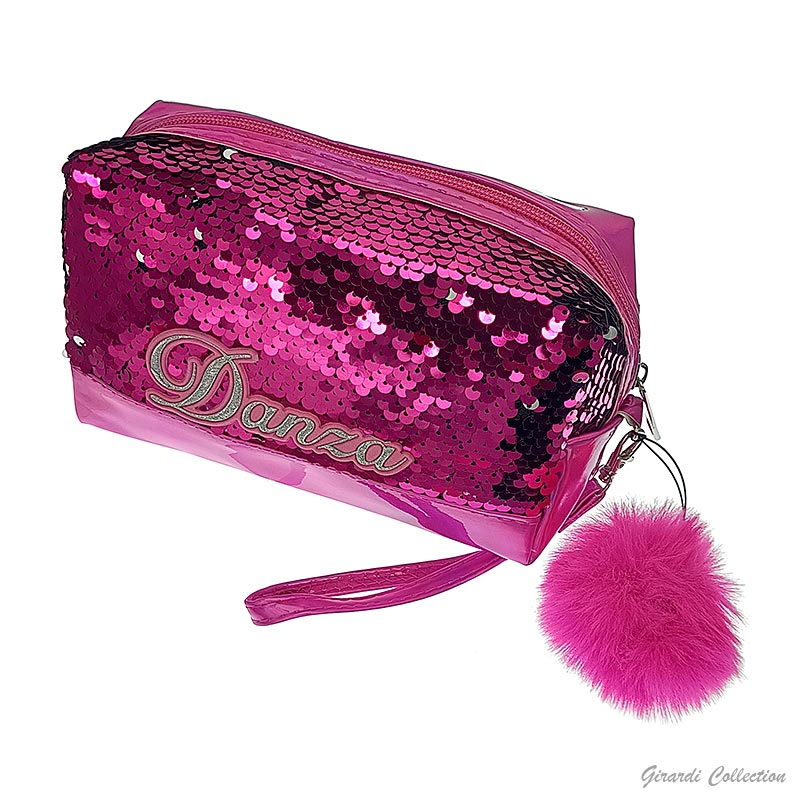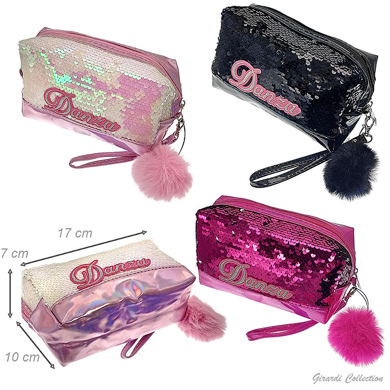 Bolsa de mão estilo clutch para dança, em PVC brilhante com lantejoulas e pompons de pelo sintética.
