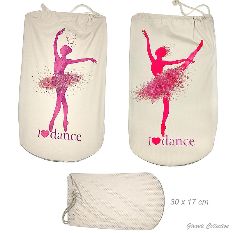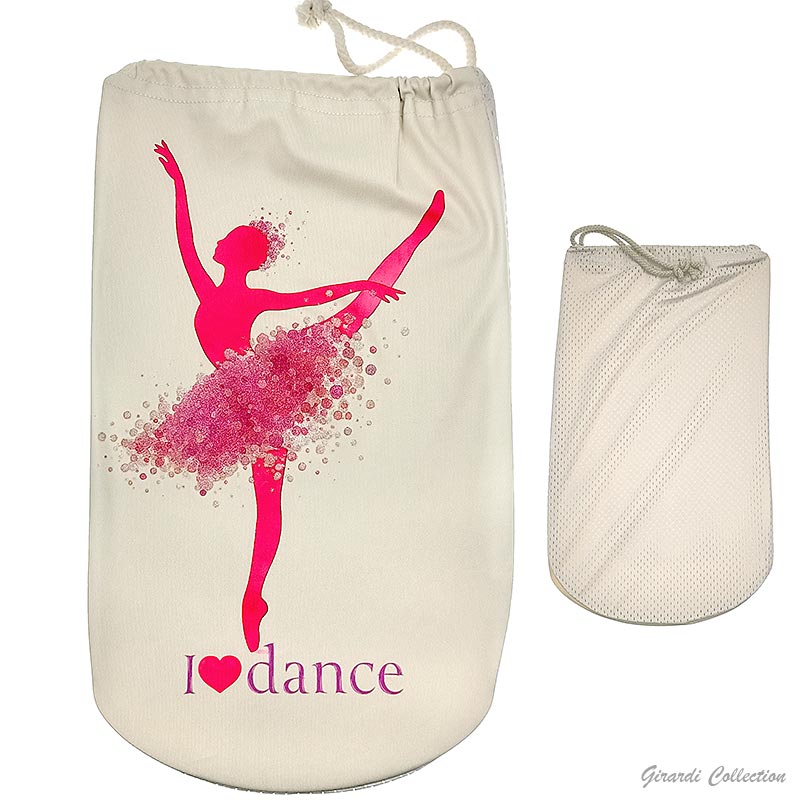 Saco para pontas com efeito aguarela e tutu com pontos de glitter.